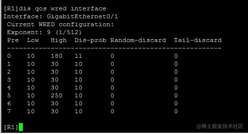 [R1-GigabitEthernet0/1]qos wred ip-precedence 0 low-limit 10 high-limit 180 discard-probability 11