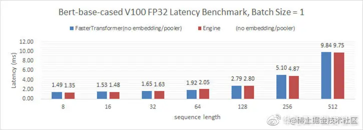 XEngine针对Bert类型模型进行优化,测试环境为NVIDIA V100,FP32计算。如下是性能对比,相对于原始框架未优化版本,在sequence length比较小的时候,有明显的性能提升。同时也和NVIDIA的SOTA解决方案FasterTransformer进行了对比,有轻微优势。