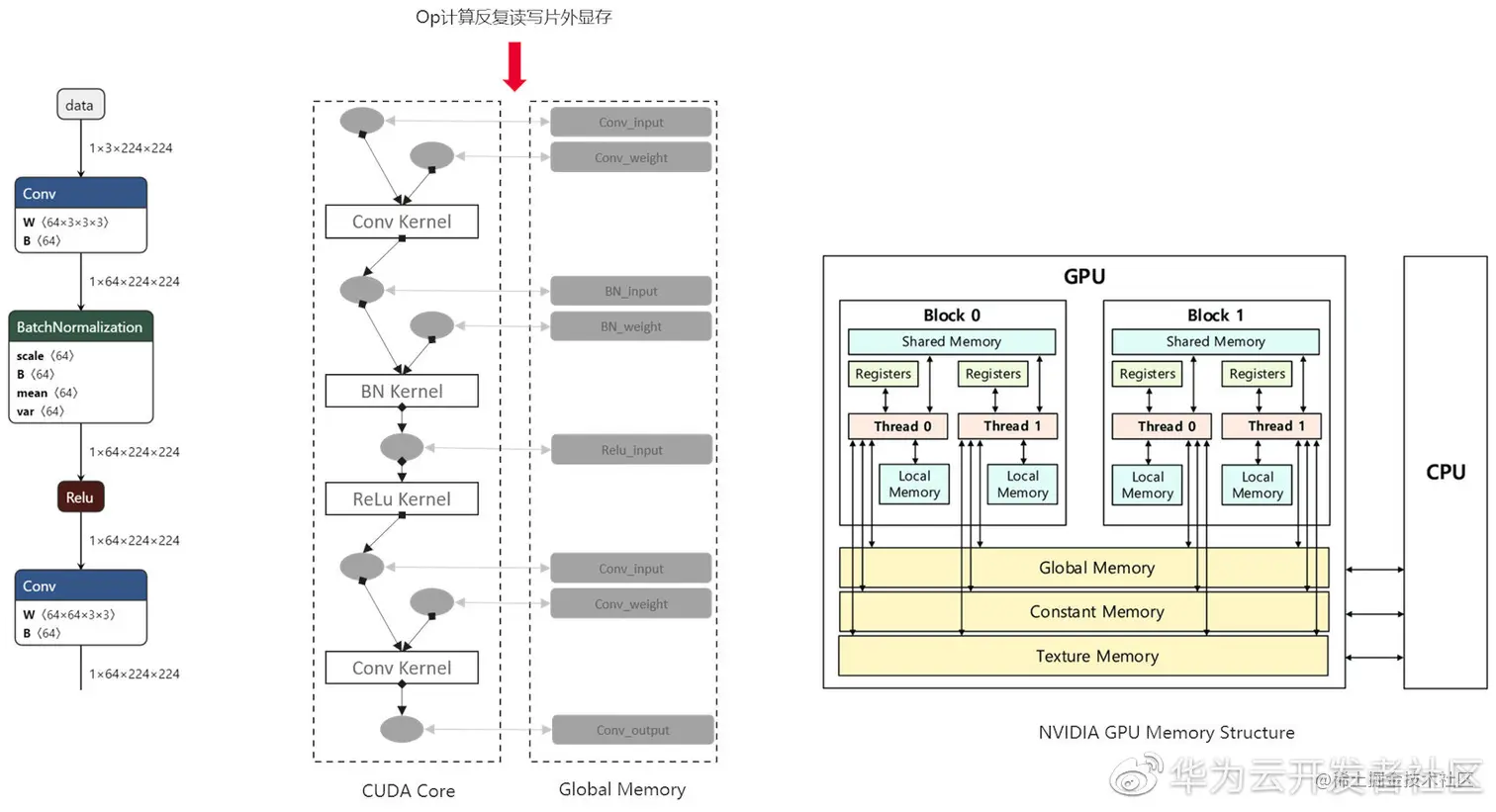 下图取了ResNet-50模型的一个片段,并抽象到计算和访存的流水线过程。我们可以看到,每个OP计算对应一个CUDA Kernel计算,每个kernel计算会从显存(Global Memory)中读取数据,在片上CUDA Core进行计算。右图为CUDA的存储架构,也符合金字塔访存原则,即越靠近片上,访存速度越快。其中Global Memory是GPU的显存,访问速度最慢;而片上的Shared Memory次之;最快的是片上Register空间。当模型的算子OP比较多的时候,模型推理计算会反复读写显存,效率比较低,为了解决这个问题,常用的方法是图融合技术;当OP计算的速度越快,整个模型推理计算速度也会越快,因此我们需要高性能的算子实现。接下来会从这两个方面分析。