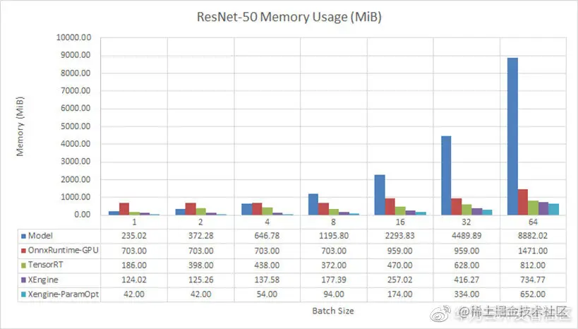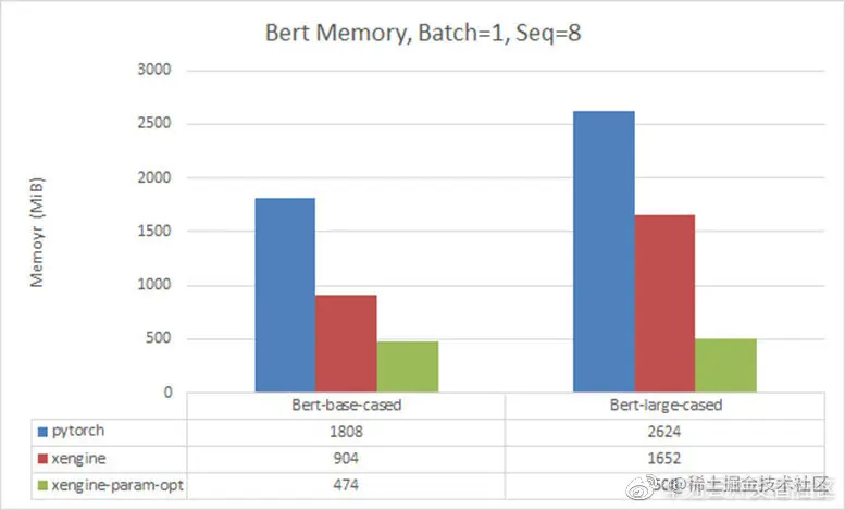 这里选取了CV和NLP两个场景的模型,对比了一下XEngine推理引擎和其他运行时引擎的显存占用,可以看到有明显的优化。如果不考虑性能开启参数优化(ParamOpt),可以进一步的降低显存占用。
