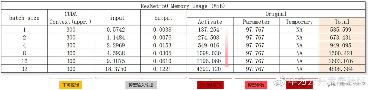 其中“不可控制空间”指系统分配的空间,如每个进程CUDA Context所占用的显存空间,一般在100-300MB左右;“用户数据”指用户自行分配的显存空间,如模型输入输出Tensor占用的空间;“模型参数”指训练的深度学习模型的参数所占用的显存空间,我们需要将模型参数加载到显存中,才能进行计算;“运行时空间”是指模型的算子在计算的时候,需要的显存空间。