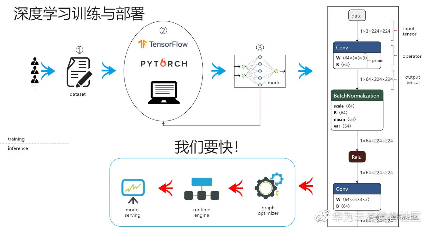 深度学习模型的开发周期,包括训练阶段和部署阶段。训练阶段,用户需要收集训练数据,定义自己的模型结构,在CPU或者GPU硬件上进行训练,这个过程反复优化,直到训练出满意精度的模型。有了模型之后,我们需要将模型服务部署运行,我们期望服务延迟越低越好,吞吐越高越好。这里会从显存优化,计算优化两个方面来分析一下如何进行深度学习模型推理优化。
