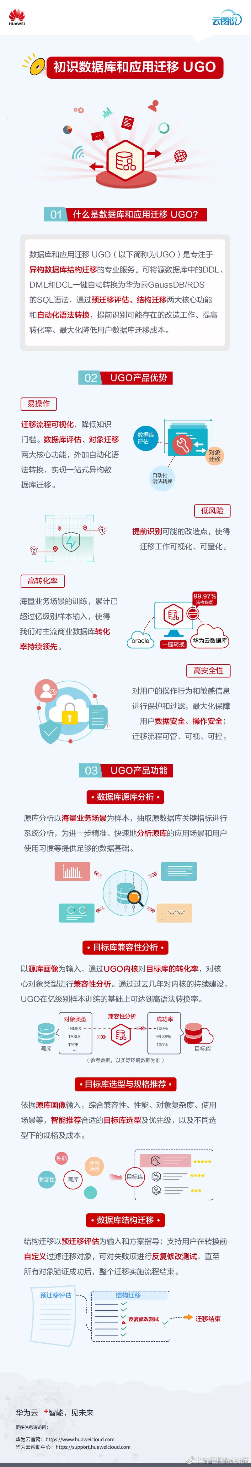 数据库和应用迁移 UGO(以下简称为UGO)是专注于异构数据库对象迁移和应用迁移的专业化工具,帮助用户解决替换数据库风险大的难题。华为云UGO可将源数据库中的DDL、DML和DCL一键自动转换为华为云GaussDB/RDS的SQL语法。通过预迁移评估、结构迁移两大核心功能,实现主流商业数据库到华为云数据库的自动化搬迁,助力用户轻松实现一键上云、一键切换数据库的目的,帮助用户提前识别风险、提高转化率、最大化降低数据库迁移成本。云图说带您详细了解华为云UGO的优势和功能: