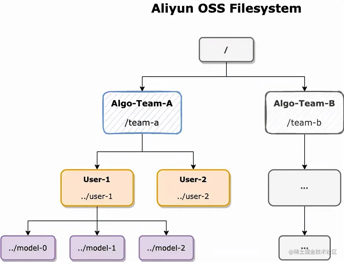 因此典型的管理方式就是把它们当作文件,托管在统一的对象存储中(如阿里云 OSS 和AWS S3),每个租户/团队分配一个目录,各自成员再把模型文件存储在自己对应的子目录中,由 SRE 来统一进行读写权限的管控: