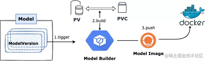 创建出 Model Builder 进行用户态的镜像构建,Model Builder 我们采用了 kaniko 的方案,其构建的过程与镜像格式,和标准的 Docker 完全一致,只不过这一切都在用户态发生,不依赖任何宿主机的 Docker Daemon;