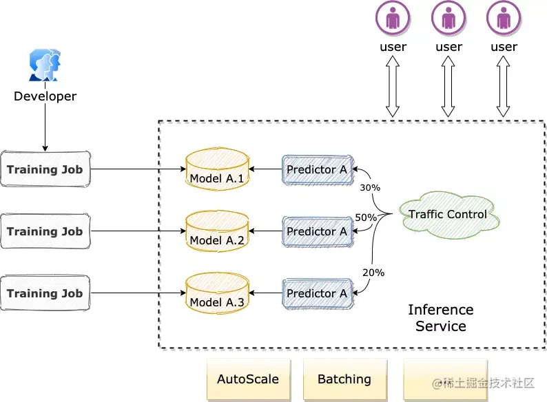 对于一个完整的推理服务,可能同时 Serve 多个不同模型版本的 predictor,比如在常见搜索推荐的场景中,期望以 A/B Testing 实验来同时对比多次模型迭代的效果,通过 Inference+ModelVersion 可以很容易做到。我们对不同的 predictor 引用不同版本的模型,并分配合理权重的流量,即可达到一个推理服务下同时 Serve 不同版本的模型并灰度比较效果的目的: