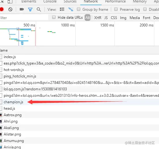 如果你有好的方法解决这个问题,可以在评论处提出,十分感谢! - 接下来在知道了规律的情况下,那么如何获取每个不同英雄的编号呢?在其他博主的引导下,发现LoL资料库中有所有英雄的头像,通过F12的慢慢查找,发现了这个js文件!