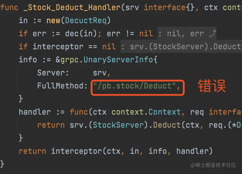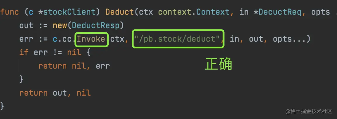 在开发接入的过程中,去找 *.pb.go 的文件中的 grpc 访问的方法路径时候,一定要找 invoke 的路径