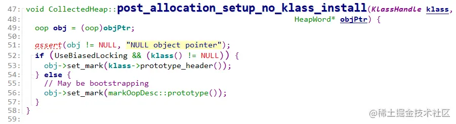JVM创建对象的步骤是先申请内存,然后对这块内存进行数据填充。数据填充包括设置对象头。这个方法就是在数据填充阶段调用的。代码逻辑很简单,如果启用了偏向锁,则将这个oop对应的klass的属性property_header作为初始锁填充进去。如果没有启用偏向锁,则生成一个无锁作为初始锁填充进去。