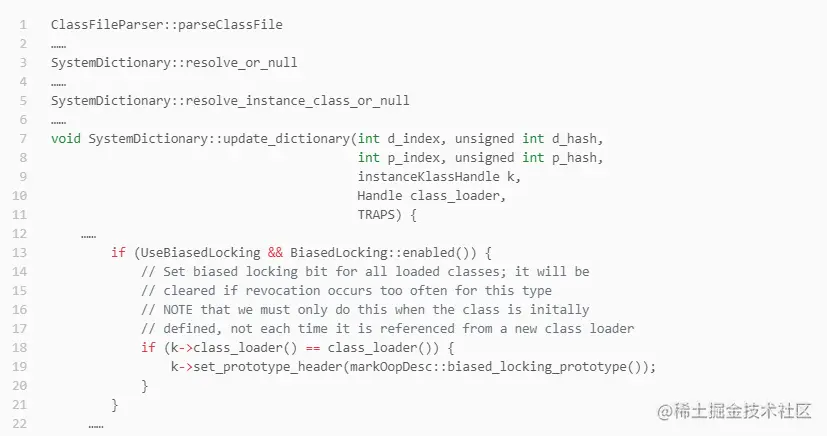 所以只剩这种可能,加载的类的锁在加载期间被改掉了,改成了偏向锁,按照这个分析我单步调试Hotspot源码找线索,终于找到了核心代码