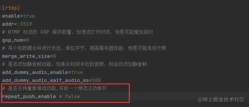 首先我们来讲重复推流的问题,这个需要修改mediaserver/tsingsee.ini里的repeat_push_enable=false,这个参数是用来关闭允许重复推流功能的参数:
