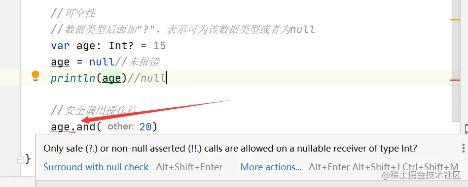 Kotlin区分可空类型和非可空类型,所以,你要一个可空类型变量运行,而它又可能不存在,对于这种潜在危险,编译器时刻警惕着。为了应对这种风险,Kotlin不允许你在可空类型值上调用函数,除非你主动接手安全管理。如下图:
