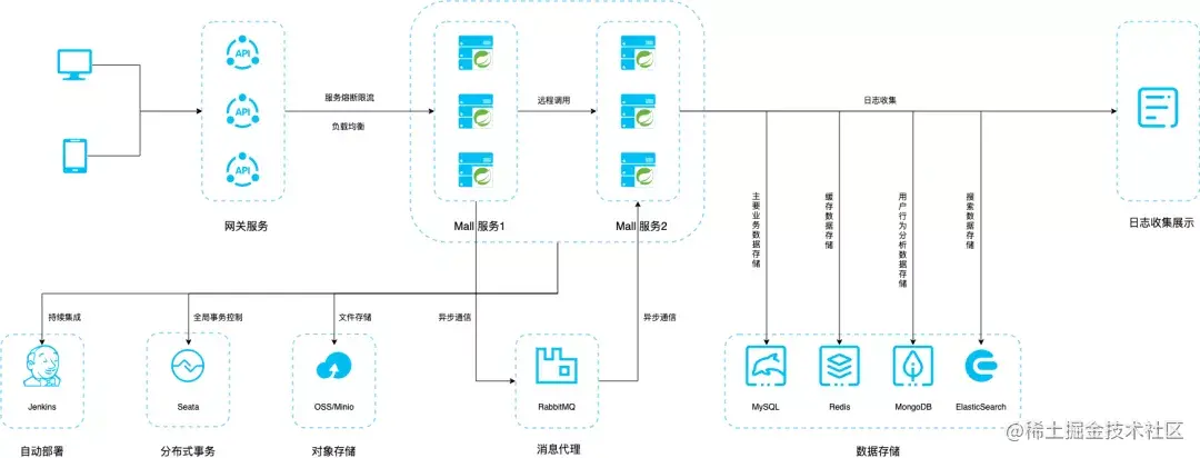 Mall 使用了 MySQL,Redis,MongoDB,ElaisticSearch 等多种数据库。主要业务数据存储在 MySQL,缓存数据存储在 Redis,用户行为分析数据存储在 MongoDB,搜索数据存储在 ElasticSearch 中。Spring Boot 应用服务间使用 RabbitMQ 实现异步通信。