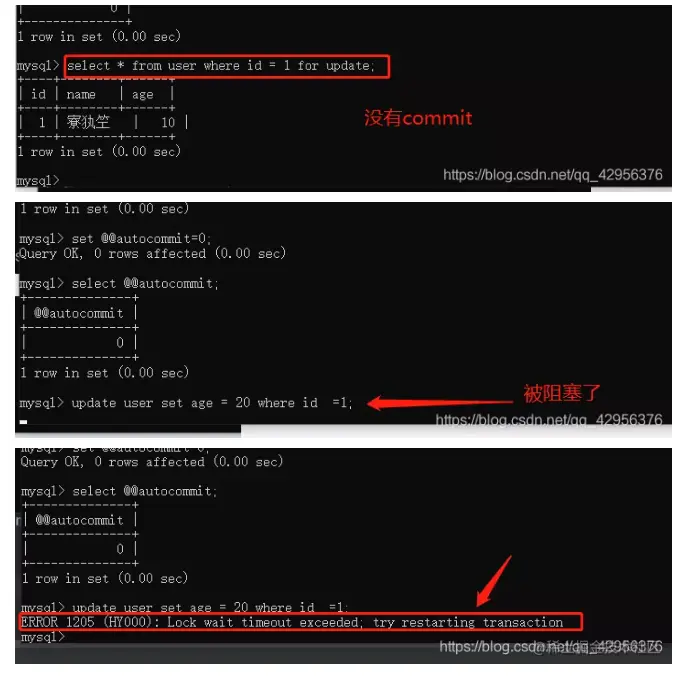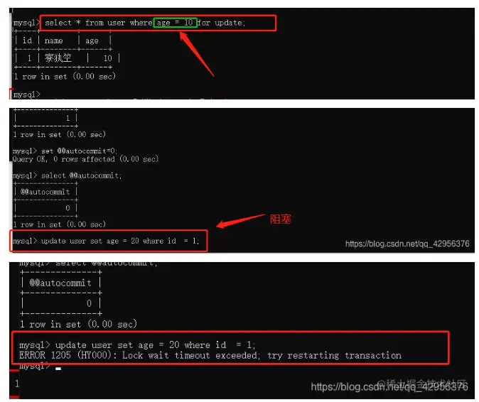 使用主键id为条件去查询,然后开启另一个事务去更新数据,更新被阻塞,加锁了,锁定要查询的id为1的行数据。