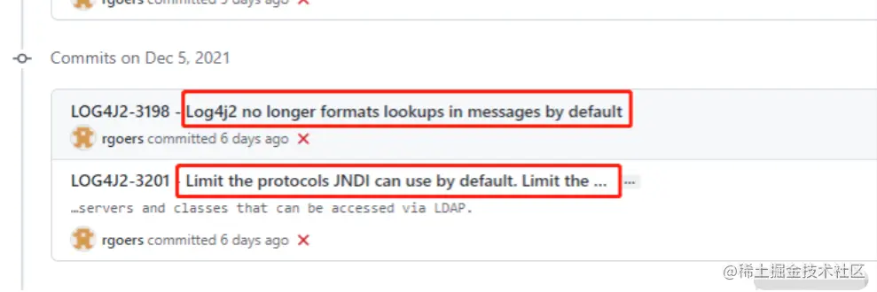 了解到log4j <=2.14.1 存在RCE的情况,我马上跑到其官方github看了一下,发现commit记录中有两个关键commit