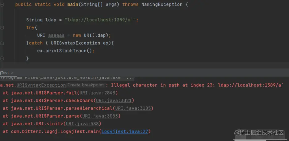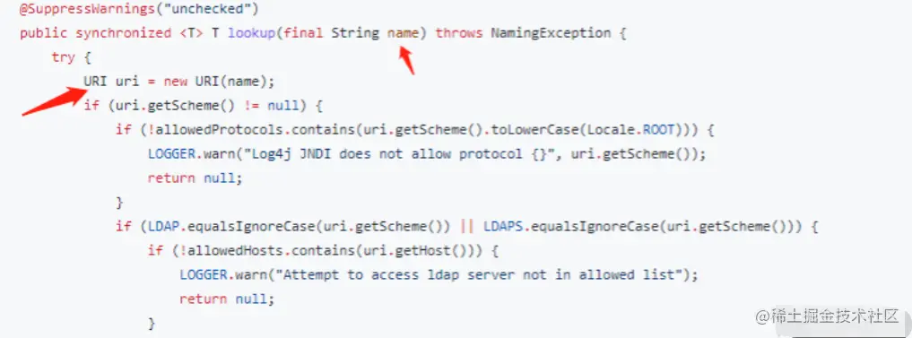 代码比较长没有完全截进来,关键点是进入lookup方法后,立即将name变量送入URI类的构造函数中,此时只要URI的构造函数对name字符串解析出错,即可跳转到catch语句,进而向下执行到JNDI操作。