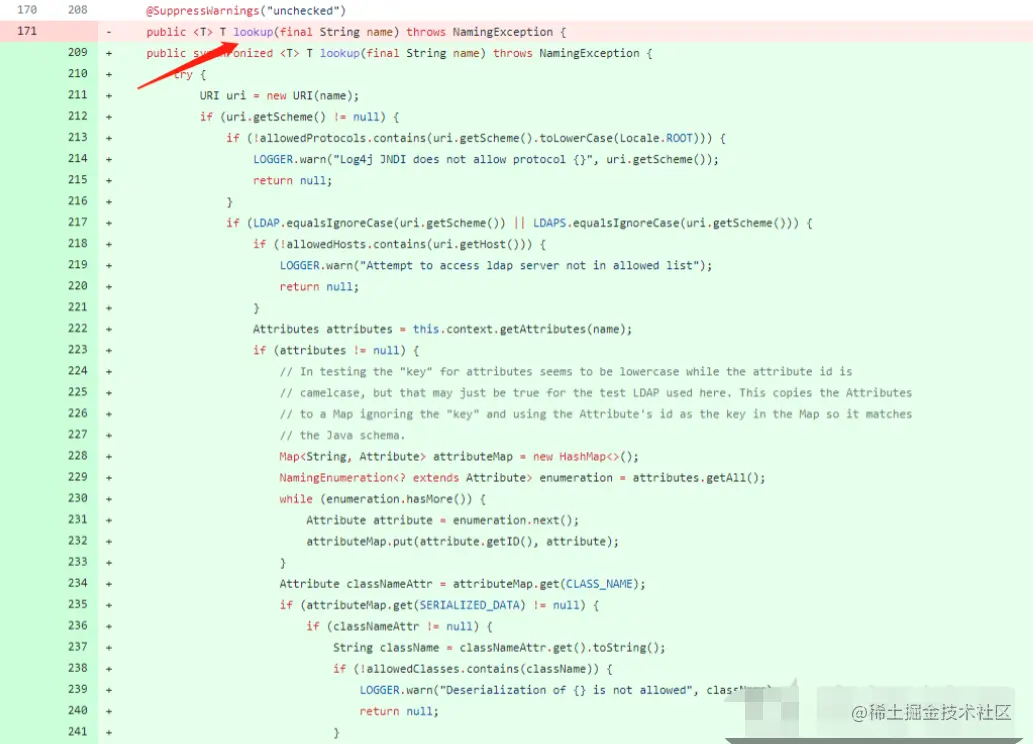 这两个点很容易联想到是不是跟JNDI攻击有关系,毕竟RMI和LDAP很容易做到RCE。跟进commit看看具体的修改情况,github.com/apache/logg… 这个commit中,对org.apache.logging.log4j.core.net.JndiManager.java进行了大量修改,特别是在lookup方法中,加了很多代码