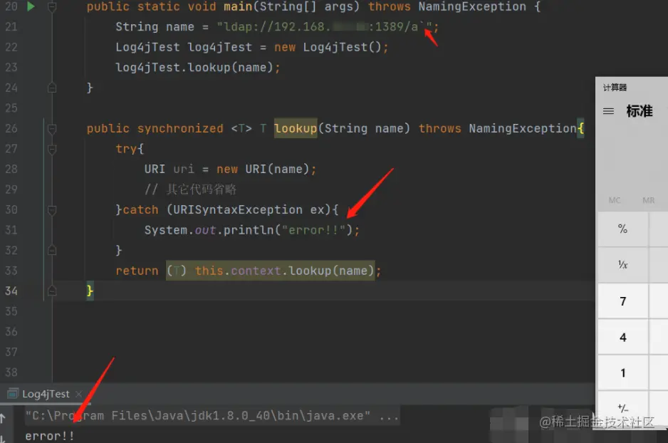 空格和尖括号同样报错,就不重复截图了。回到前面提到的2.15.0-rc1版本对JndiManager#lookup方法的修复情况,并没有在catch语句中添加返回操作或报错,程序遇到报错后,会继续向下执行,从而造成危险。