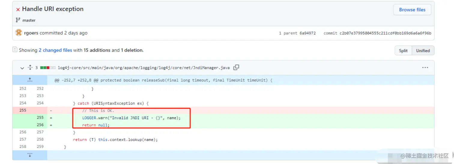 看到rc1版本存在绕过的消息,又来看看官方github仓库的commit记录,里面有一条在更新到2.15.0-rc1版本后的commit记录,提交的信息是"handle URI exception",即处理了URI出错的情况。修改代码情况如下图