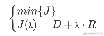 视频编码标准提供了大量的工具集,或者说编码模式,它们就相当于上图的绿点。在它们之中选择一个恰当的来使用是一件比较复杂的事情。注意到这个问题本质是一个数学最优化问题,所以可以利用拉格朗日乘数法的离散形式来解决它。简单地说,引入一个拉格朗日乘子λ,构建代价函数,再去求取代价函数的最小值即可: