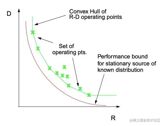 R-λ模型中的λ是率失真优化中的一个系数。这里的率失真优化,指的是编码过程中的一个优化步骤。要详细解释它,我们需要先了解率失真理论。它起源于香农的研究[2],大致可以概括为:在给定的信源分布以及可接受的失真度D下,求信息数据量R的理论最小值。显然,可接受的D越大,其对应的R也就越小。这个R-D的关系边界,我们称为率失真曲线,即下图中的红线[3]。旁边的绿线则是编码器实际工作区域的边界,它和理论值存在一定差距。