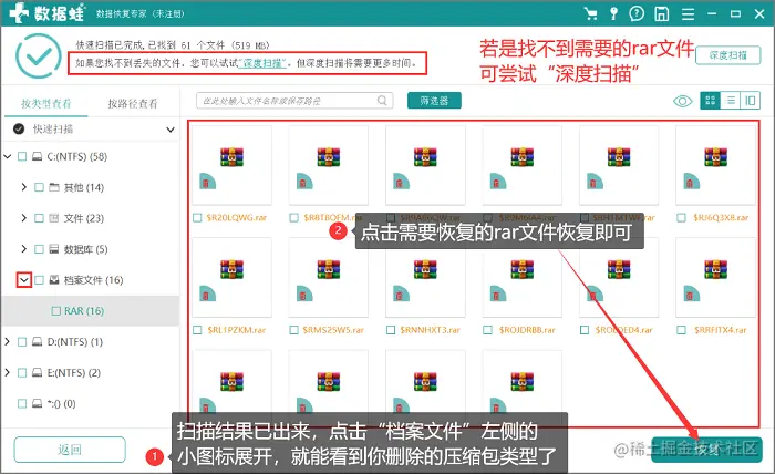 4.扫描完成,结果已出。可以看到有一个“档案文件”四字的文件类型,点击它左侧的小图标就能展开所有你删除过的压缩包文件类型,可以看到很多删除的rar文件都在里面(若是不全面可尝试深度扫描),勾选需要恢复的rar文件点击右下角的“恢复”按钮即可,可以自由选择其恢复完成的存放位置哦!