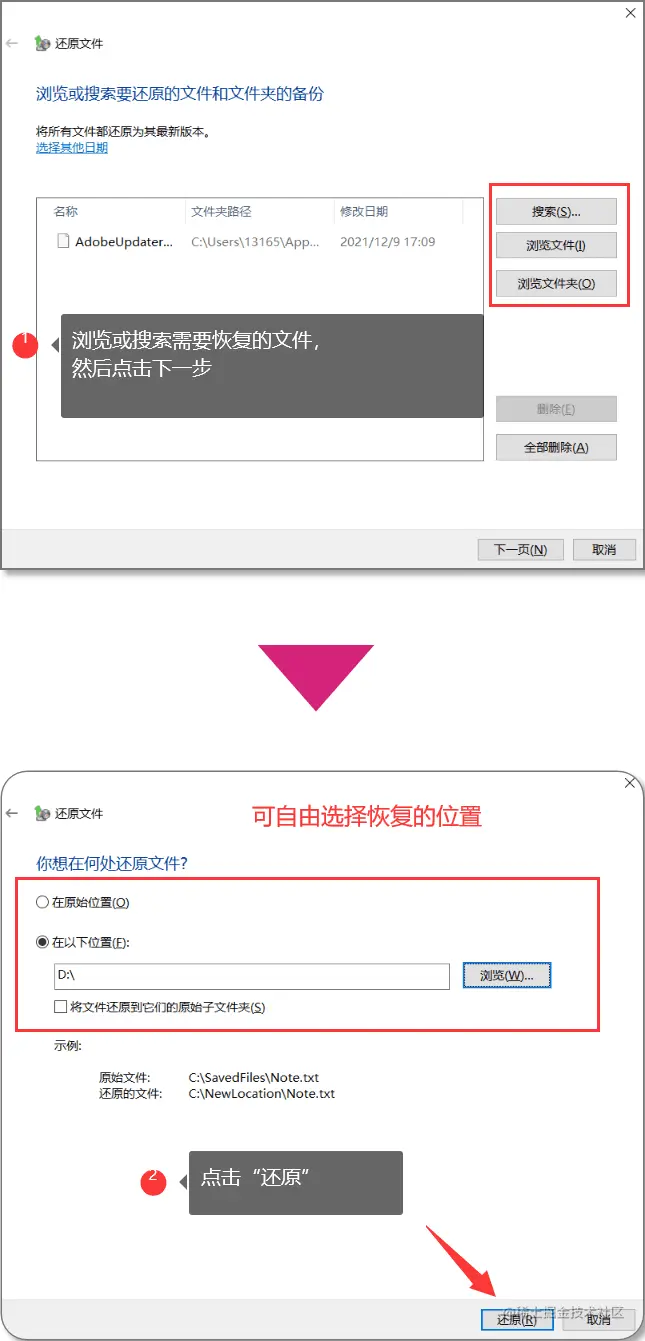 - 浏览(也可搜索名称找到文件)并选择需要还原的文件后,点击开始还原(根据实际情况,文件的大小决定还原所等待的时间,还请请耐心等待)。