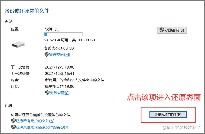 3,.鼠标停留在「还原我的文件(部分电脑显示为还原我的备份)」并点击进入还原操作界面;