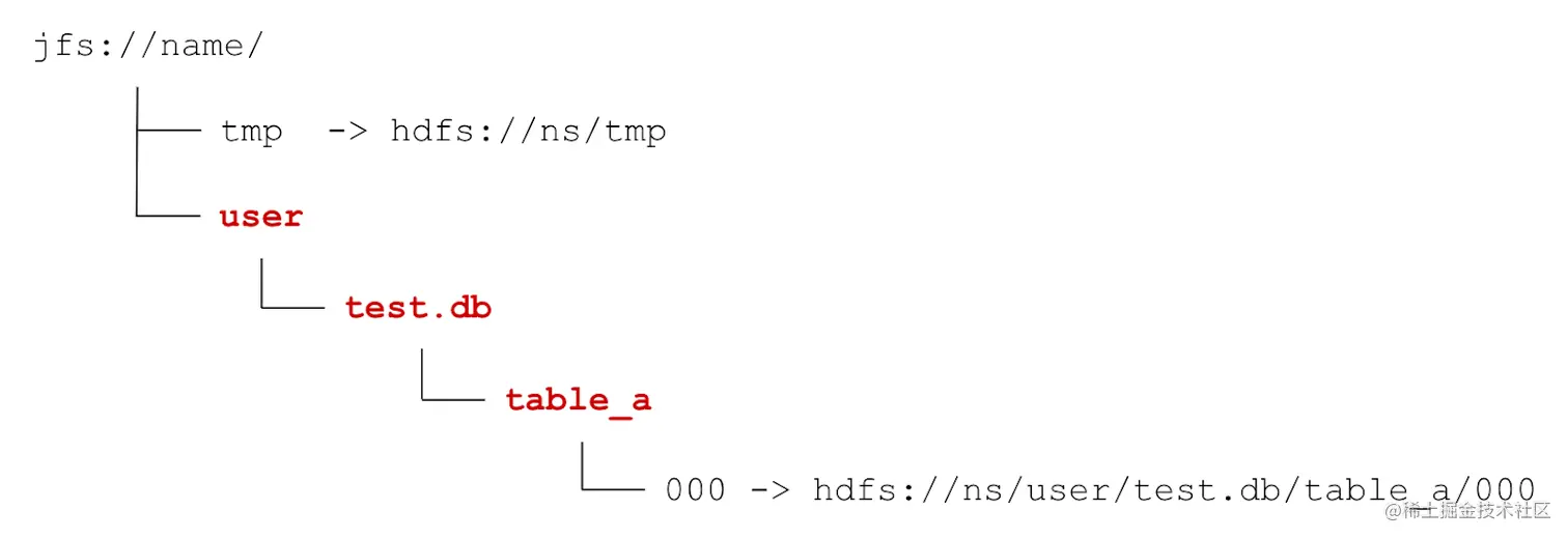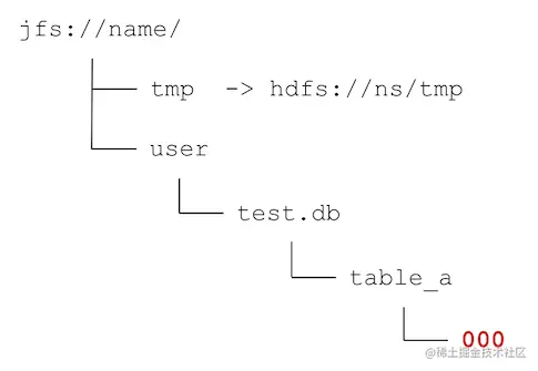 从这一步开始我们会正式进行迁移工作,不过先不着急把数据拷贝过来,我们需要先把目录结构从 HDFS 中映射过来。你可以选择你想要迁移的表或目录,然后通过 JuiceFS 提供的工具快速将 HDFS 上的目录结构迁移到 JuiceFS 上。以迁移 hdfs://ns/user/test.db/table_a 为例,这个目录中的所有子目录将会逐级在 JuiceFS 中创建。因为这一步仅涉及元数据操作,没有数据拷贝,因此可以以极快的速度将历史数据的目录结构从 HDFS 迁移到 JuiceFS 上。同时需要注意的是,所有文件仍然通过符号链接的方式指向 HDFS 中的路径。如下图所示,红色部分即表示在 JuiceFS 上新创建的目录。