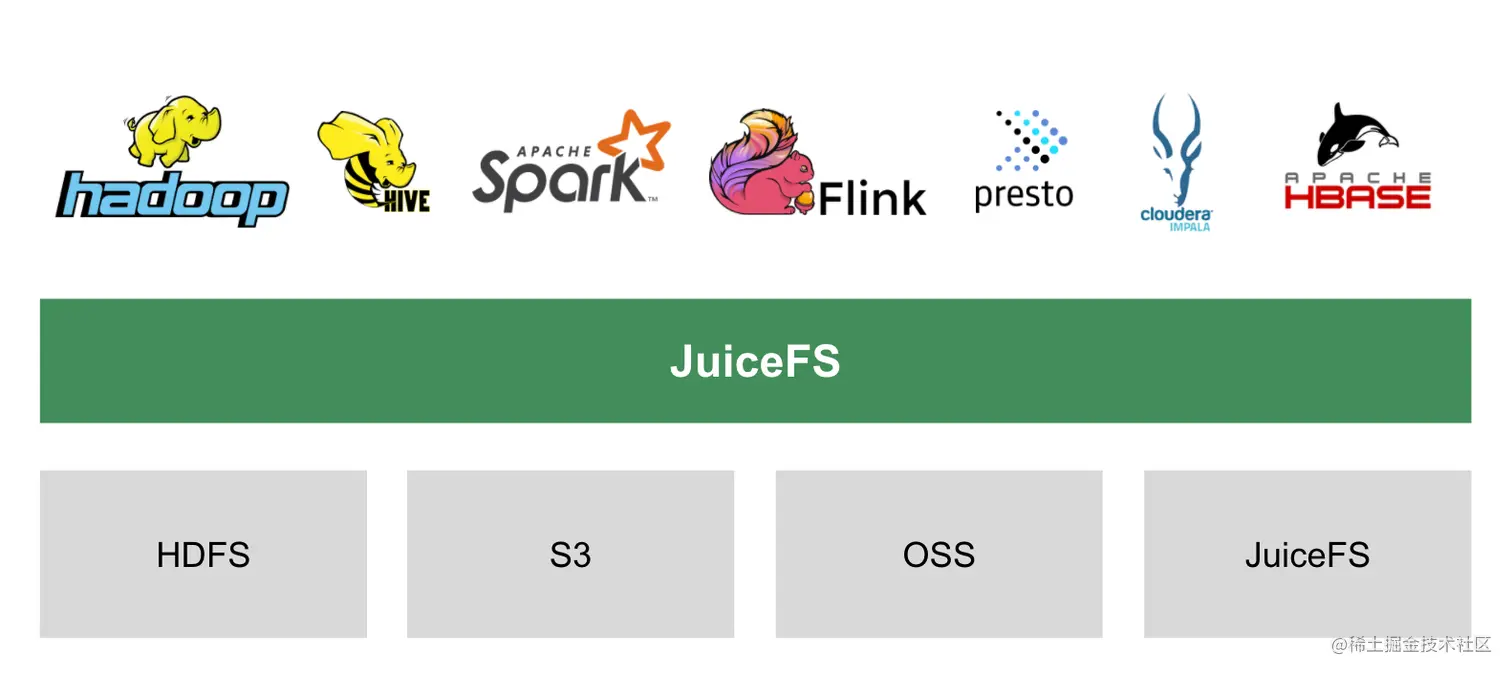 符号链接是操作系统中广泛应用的概念,你可以通过符号链接实现在一个目录树中管理分散在各个地方的数据。对应的,我们也可以通过 JuiceFS 的符号链接特性实现在一个文件系统中管理多个存储系统。其实符号链接这个功能早在 2013 年 Hadoop 社区就已经想要在 HDFS 上实现(HADOOP-10019),但遗憾的是目前为止还没完整支持。借助符号链接即可在 JuiceFS 上管理包括但不限于 HDFS、对象存储在内的各种存储系统,表面上看起来访问的是 JuiceFS,但实际访问的是底层真实的存储。