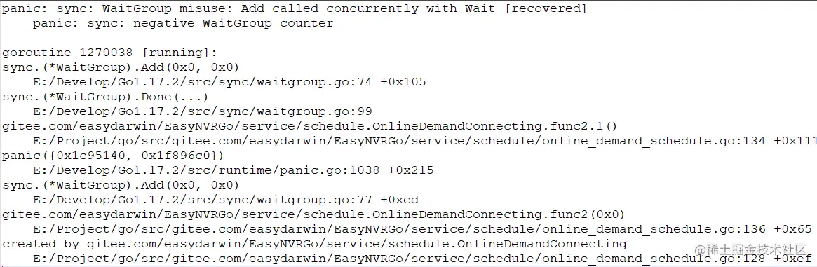 在一个EasyNVR现场,出现程序崩溃的问题 Add called concurrently with Wait,对应日志如下: