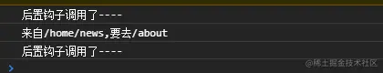 beforeEnter的参数与全局守卫一样,修改about路由的参数,添加路由独享守卫,此时只有跳转到about路由,才会打印日志。