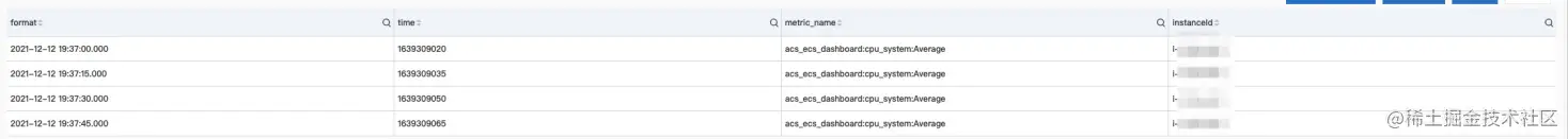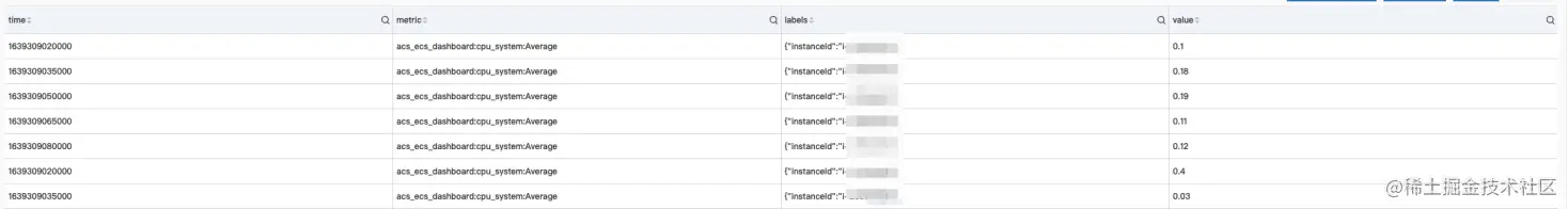 我们可以看到对于监控指标等于“acs_ecs_dashboard:cpu_system:Average”而言,某个特定的实例是每隔15秒一个监控指标。但是由于我们使用的数据导入,将结果写入到SLS的MetricStore中,因此是每分钟写入如一分钟的监控数据。