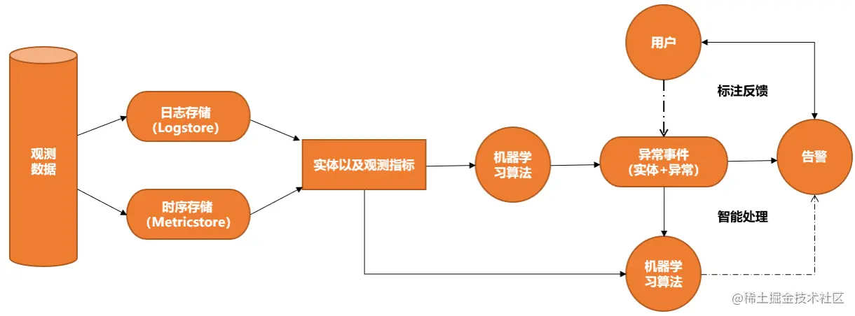 智能异常分析应用围绕运维场景中的监控指标、程序日志、服务关系等核心要素展开,通过机器学习等手段产生异常事件,通过服务拓扑关联分析时序数据和事件,最终降低企业的运维复杂度,提高服务质量。产品架构图如下所示。