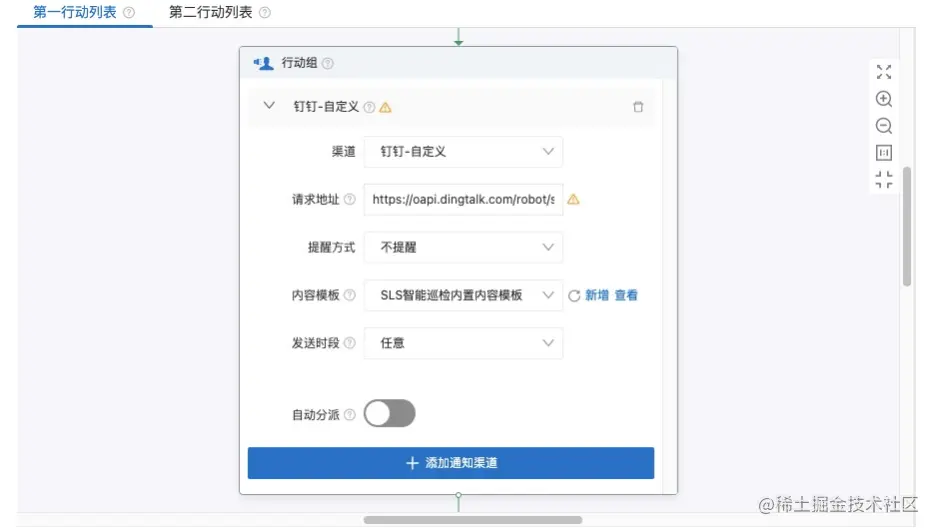 这里您要制定对应的请求地址(钉钉机器人的地址webhook),内容模板选择【SLS智能巡检内置内容模板】。这样可以将【告警配置】与【巡检作业配置】解耦开来,后续用户需求修改【巡检作业】配置就可以实现告警配置的更新。至此,我们在【云监控数据】中配置巡检算法的操作就完成了。