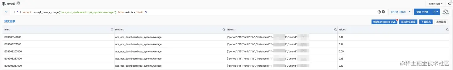 * | select __time_nano__ / 1000000 as time, __name__ as metric_name, element_at(__labels__, 'instanceId') as instanceId from "test01.prom" where __name__ != '' and __name__ = 'acs_ecs_dashboard:cpu_system:Average' order by time, instanceId limit 100000