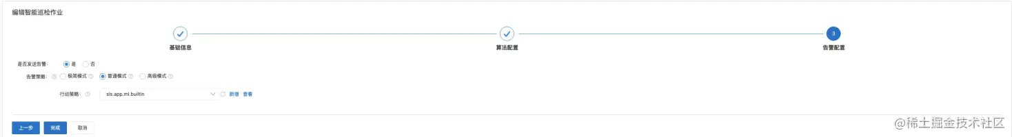 建议您使用普通模式却设置告警,在【行动策略】这一栏中,选择我们内置的行动策略(sls.app.ml.builtin),这里我们已经配置好了,具体可以在告警配置中进行查看,查看地址具体: