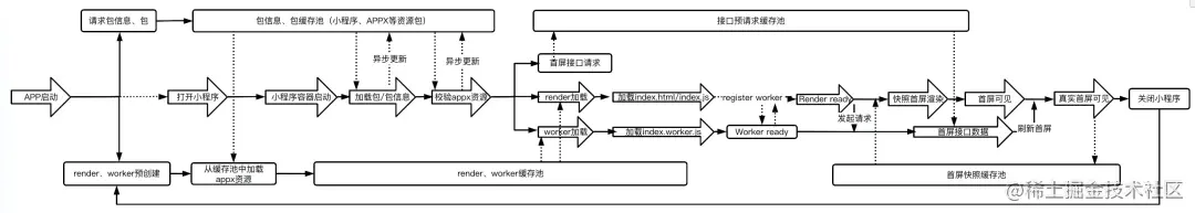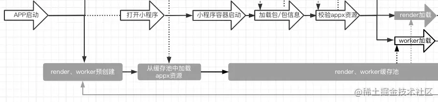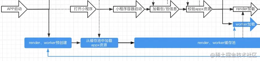 在APP启动后闲时和小程序关闭后,均会触发Worker的预创建及Appx资源的单独加载,放入缓存池中待下次打开小程序直接复用且仅限当次打开的首个小程序有效(参考上述时序图)。