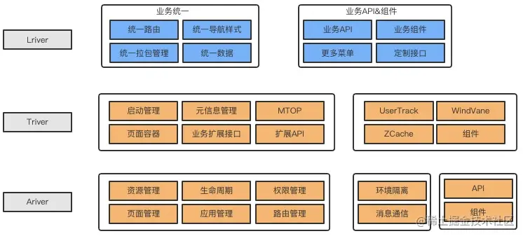 本地生活小程序容器(Lriver)是基于阿里技术体系下的小程序容器基础能力(Triver/Ariver)建设而成。作为本地生活小程序容器平台层,Lriver灵活定制和支持了本地生活场景下的诸多能力包括 路由、包管理、导航栏、业务组件/API扩展、数据存储、性能优化等,具体层级结构如下: