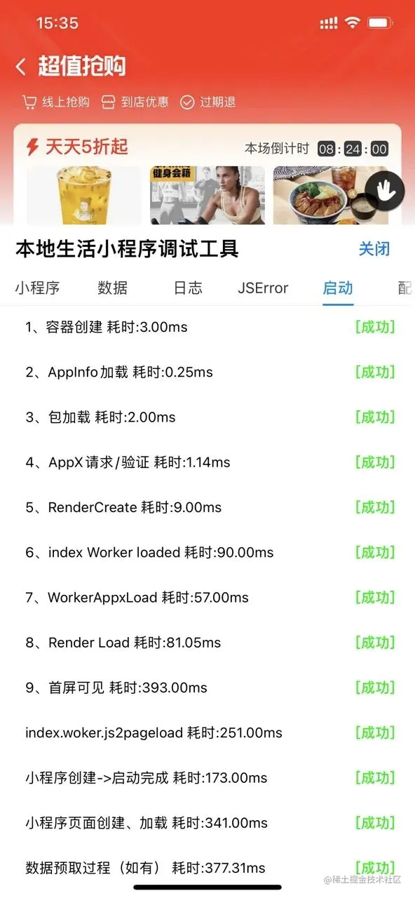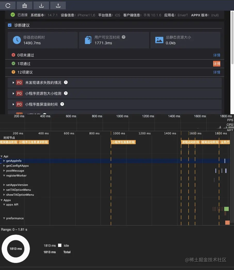 容器会通过 核心链路性能埋点上报 和 首屏启动性能检测工具 这2个方面来监控小程序首屏数据性能表现。在研发阶段通过收集容器启动链路耗时信息,辅助发现小程序总体性能表现及各个阶段性能耗时占比,以便小程序上线前及时发现性能瓶颈点,有助于针对性排查优化。同时,饿了么端也支持结合IDE生成的小程序链接,借助阿里小程序性能检测平台上报性能数据分析性能瓶颈点并给出优化建议。