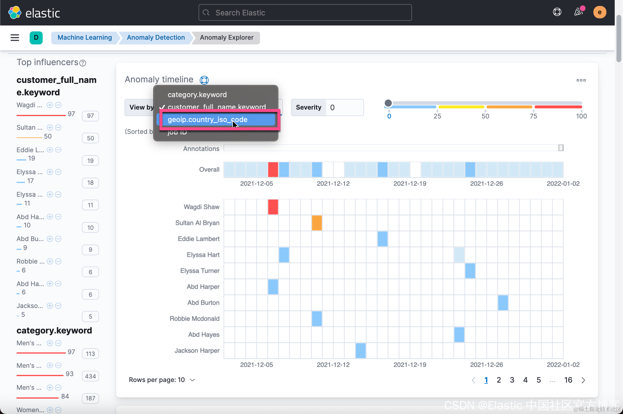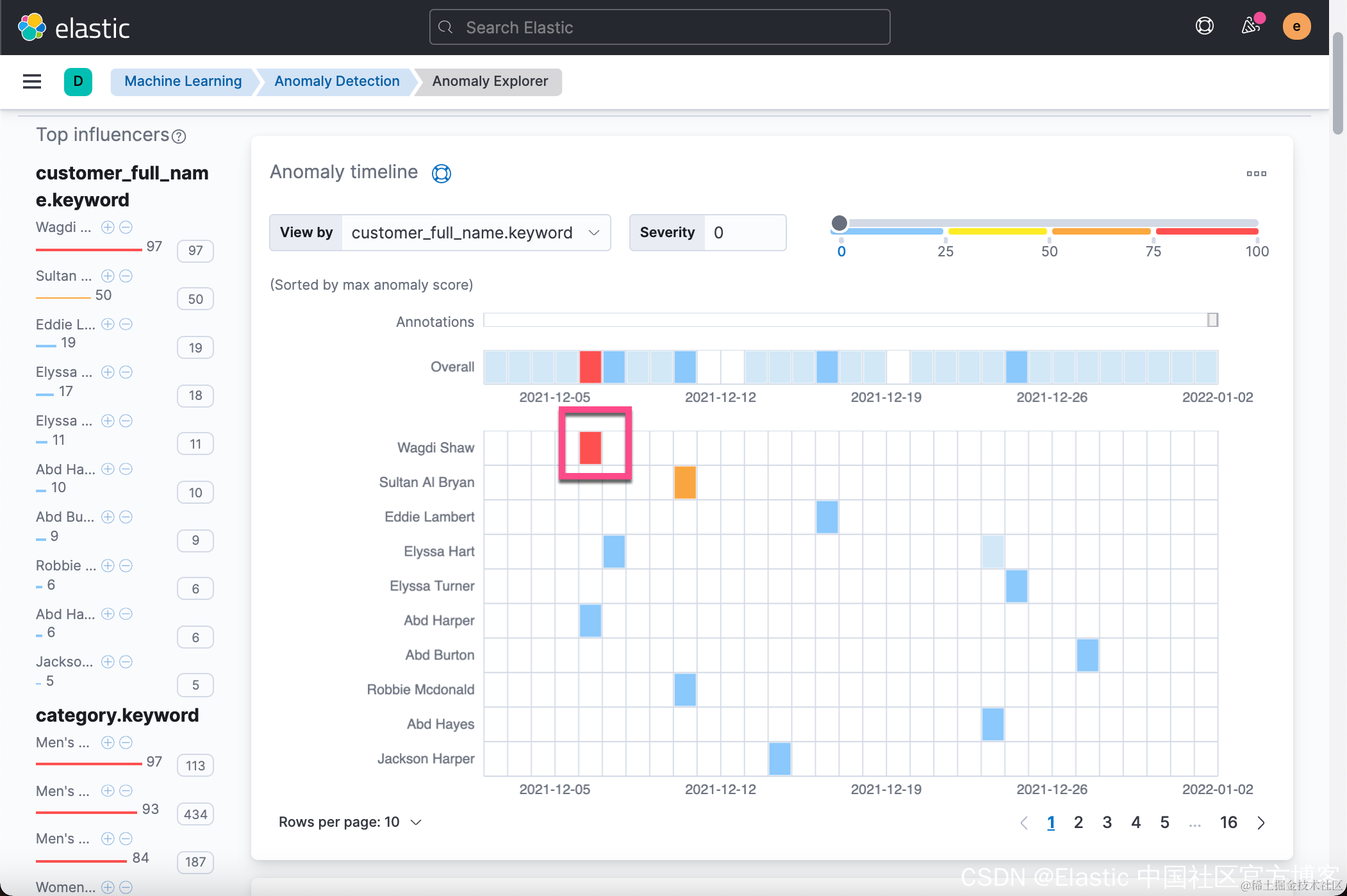 在上面的图中,它列出来一些异常的顾客。从上面的图中我们可以看出来 Wagdi Shaw 在2021-12-06日有异常。 这个是按照 customer_full_name 来进行划分的。我们也可以依据我们刚才添加的 influencer 来进行划分: