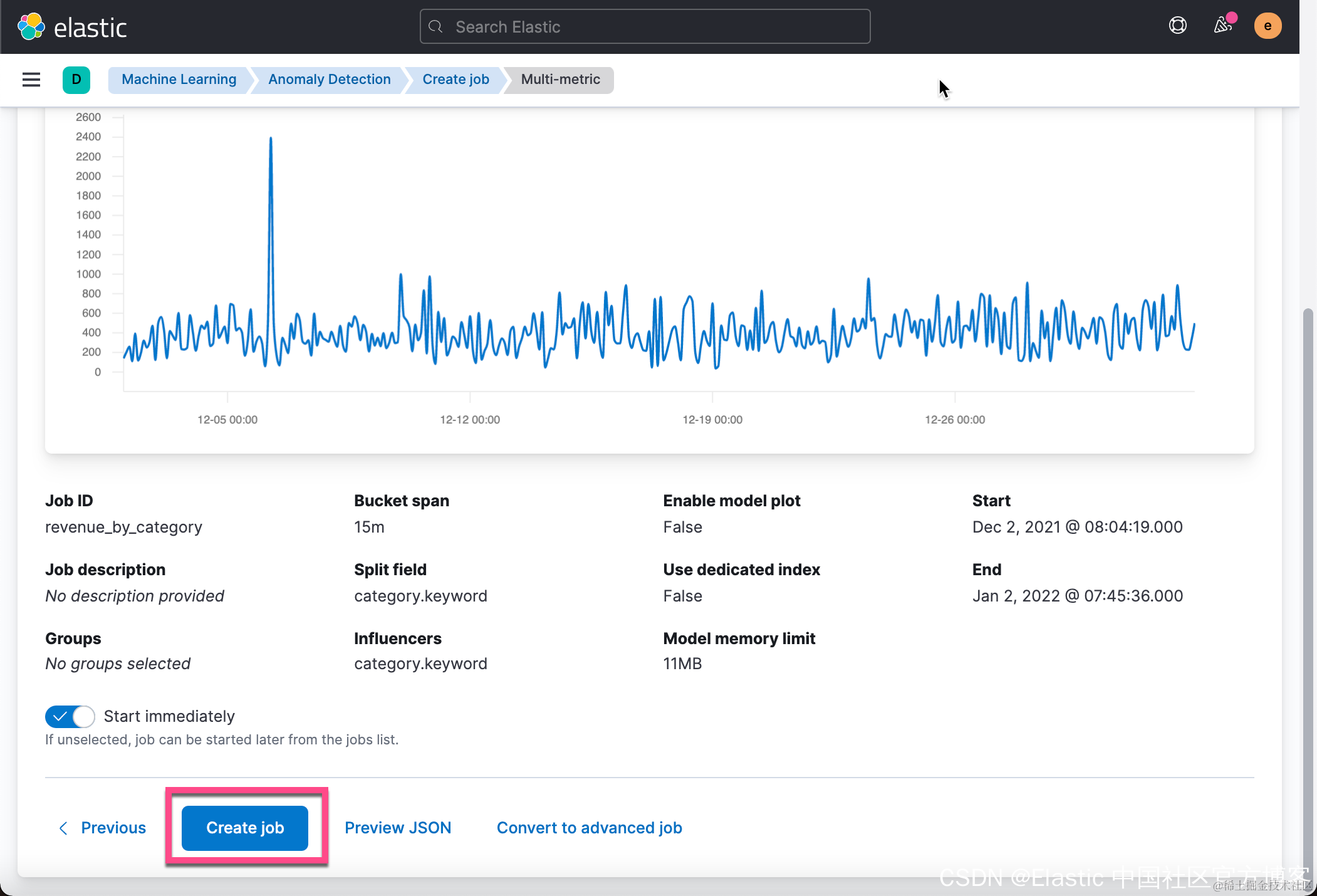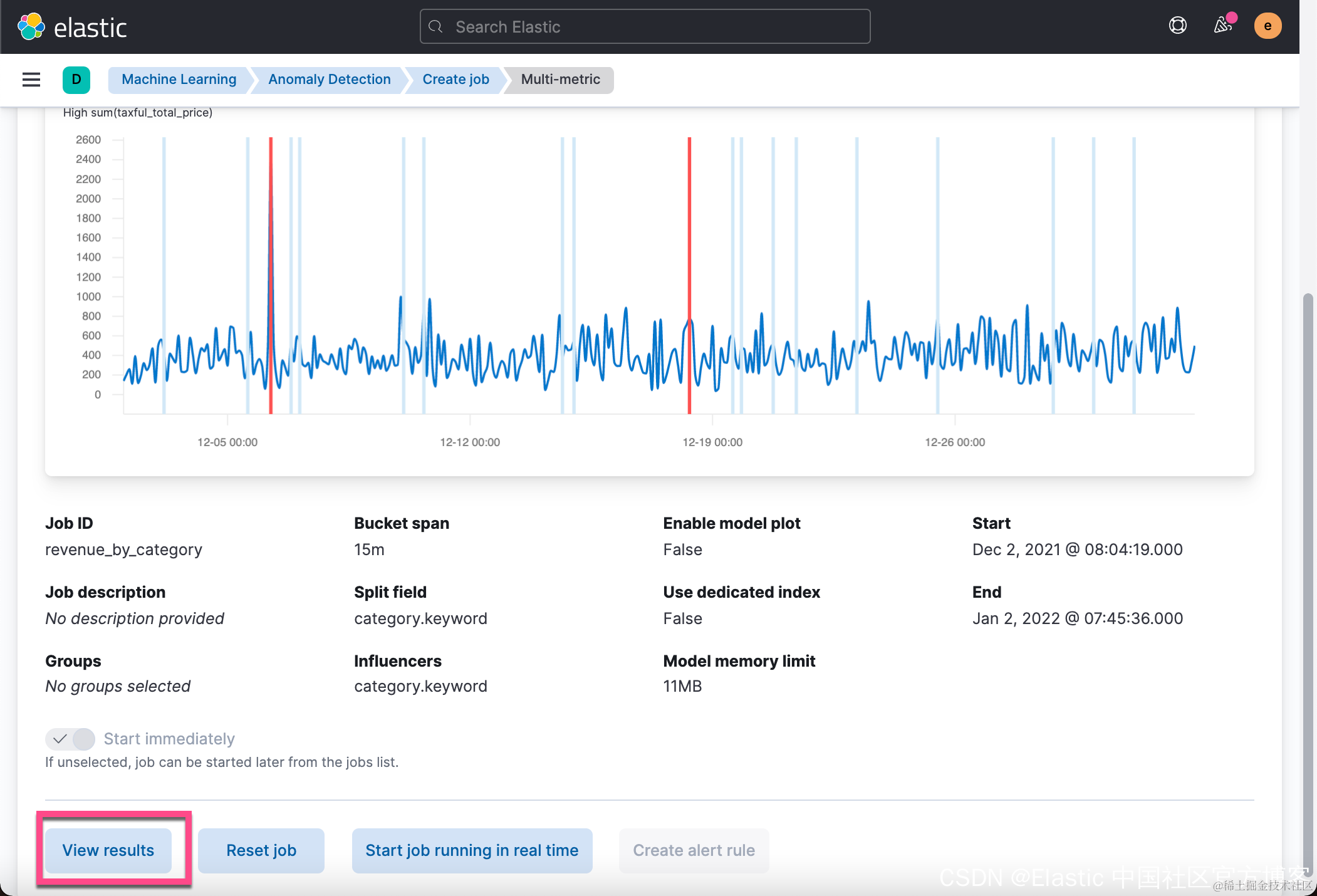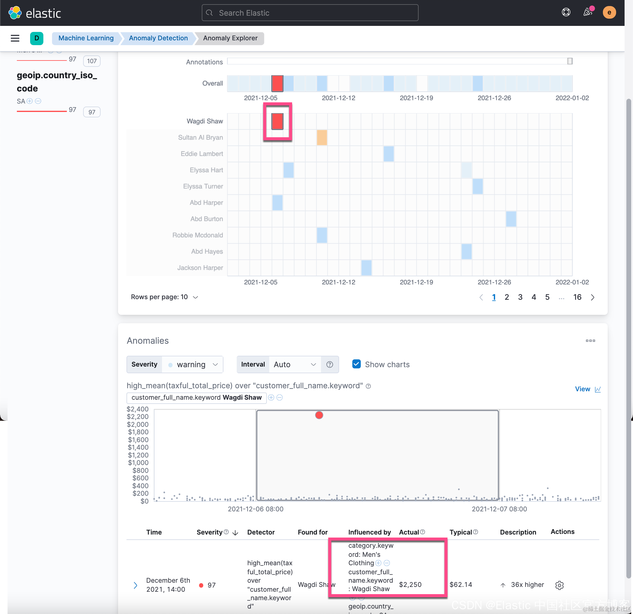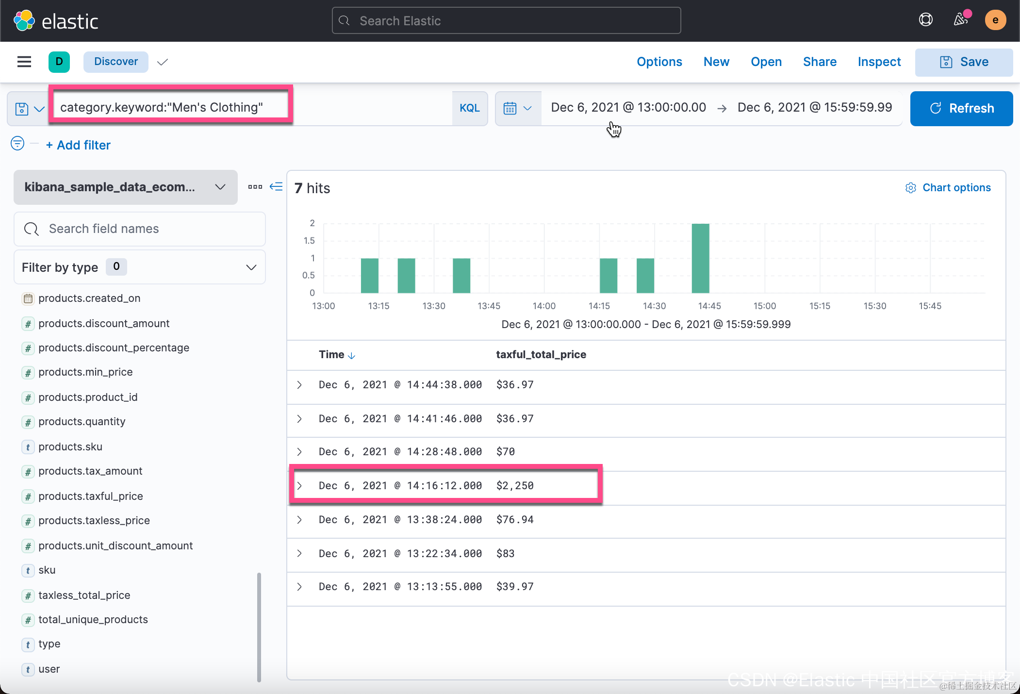 从上面的 Discover 中,我们可以看到在 2021-12-06 有一个订单的价值是2,250美金。这个销售额比平时的值要大很多。