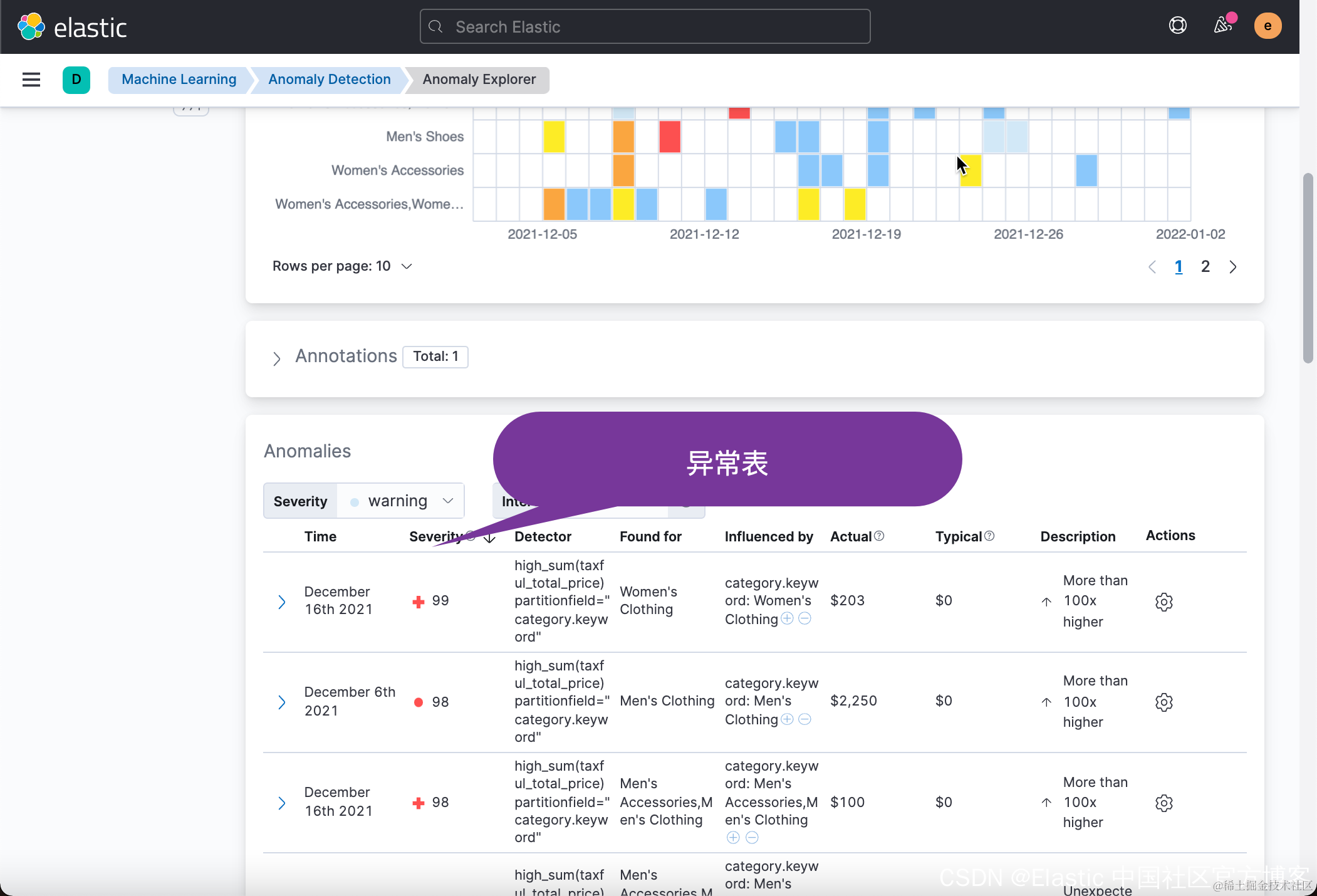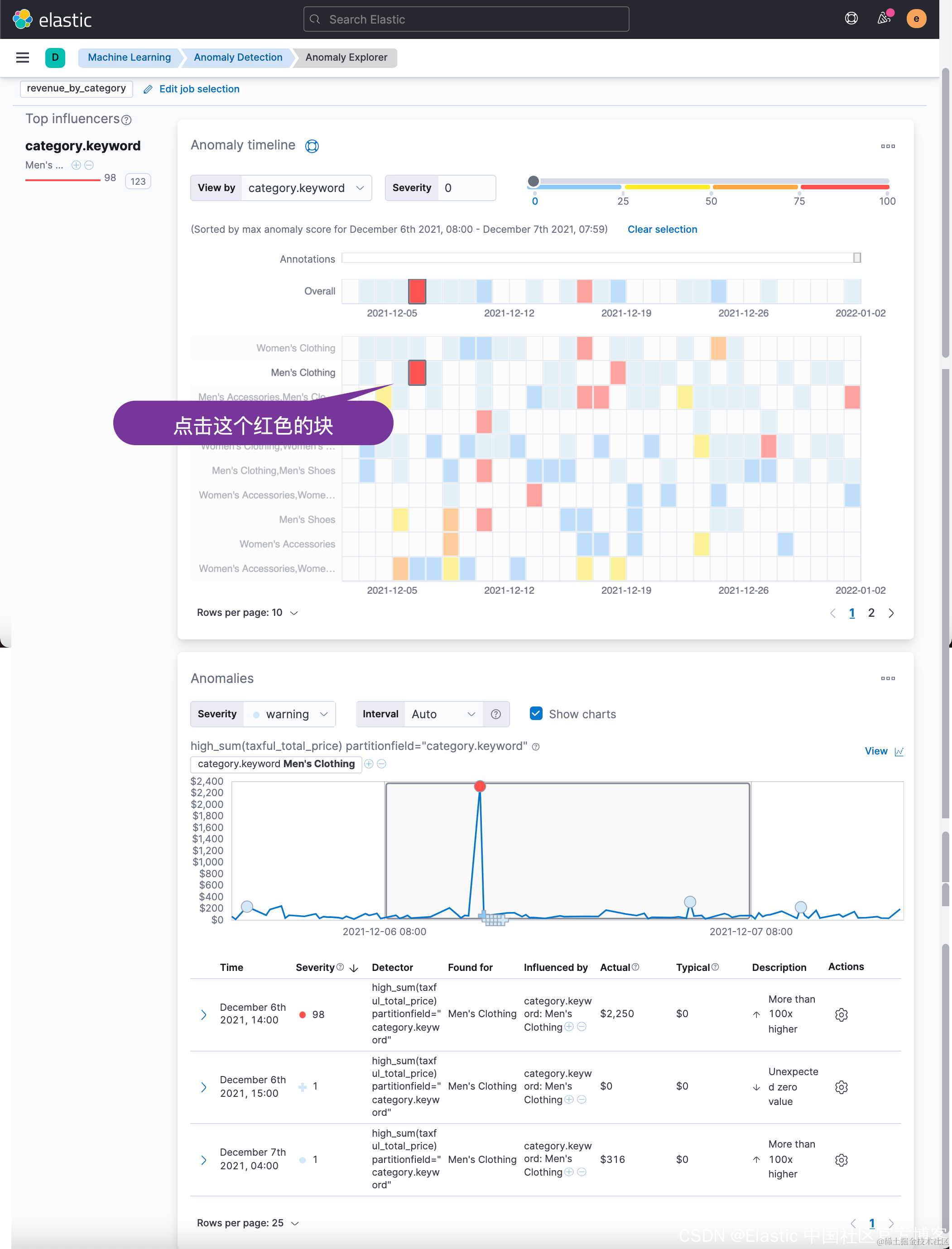 默认打开的就是一个叫做 Anomaly Explorer 的界面。相比较 Single-metric 而言,这个界面有所不同。它有更多的展现。最上面的 overall 给出的是整体的异常。我们可以看出来在 2021-12-06 及 2021-12-16 两处有异常,表明这两天的销售整体来说非常好。而下面像是热力图的网格每一行表明了每一个 category 的异常情况。相比较 Single-metric 来说,我们可以看到有多个侦测器帮我们分析异常。
