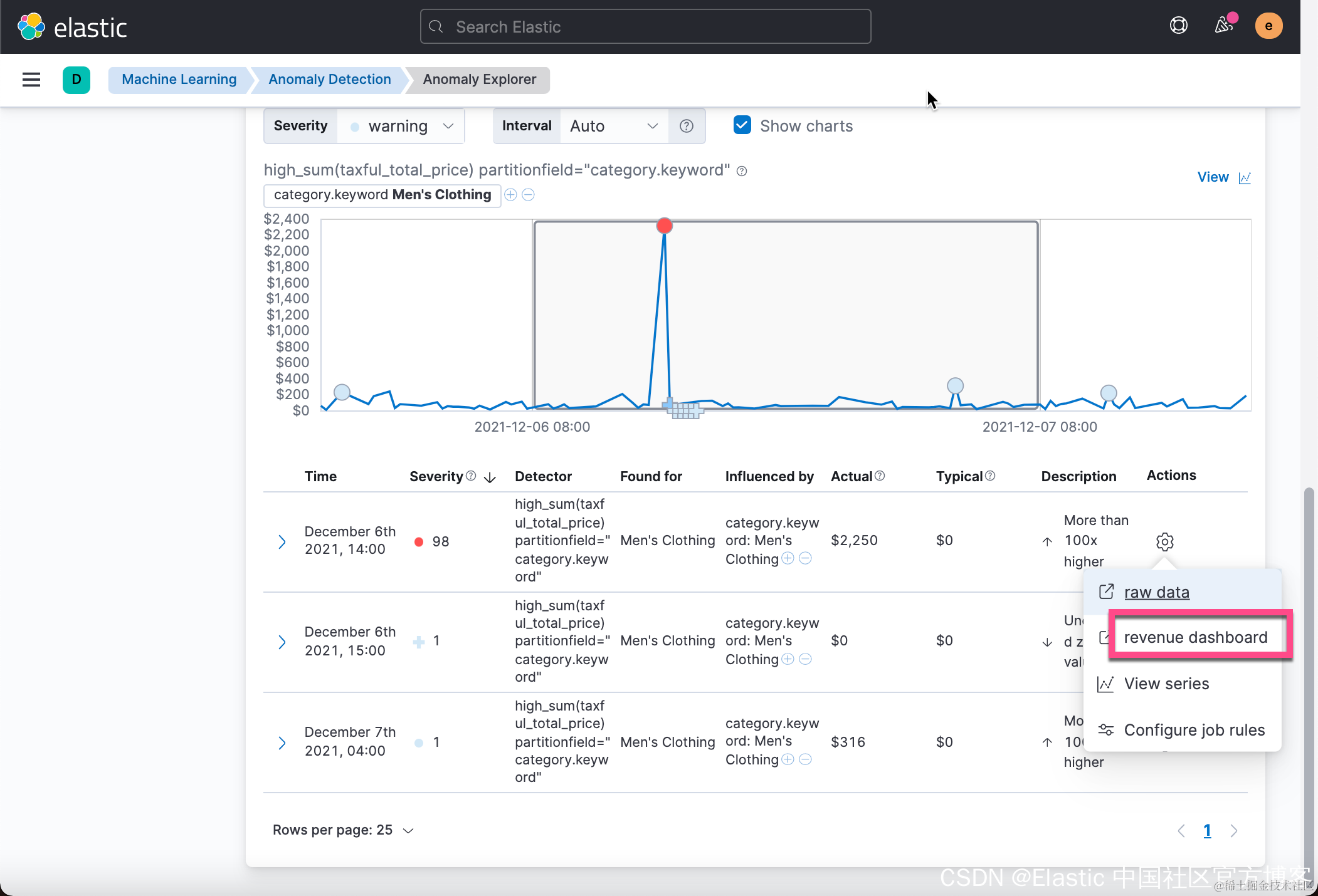 从上面的图中我们可以看出来 men's clothing 这个 category 在2021-12-06那天有一个非常大的 jump,它表明当天的销售非常火爆。这个值得我们去研究一下那天到底是发生了什么事才有这么高的销售额。我们甚至想在这个视图中很方便地连接到原始的数据。我们先注意一下如下的界面:
