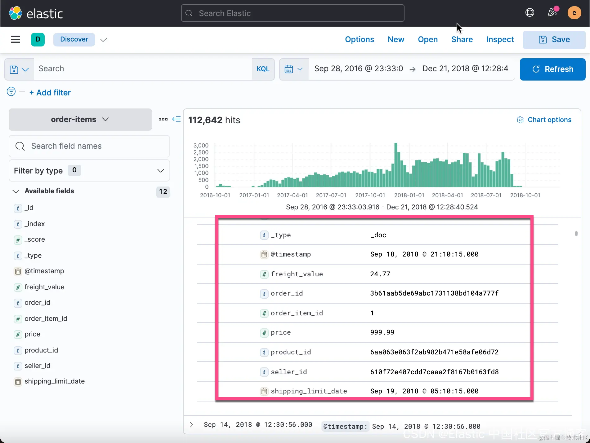 从上面的显示中我们可以看出来每个文档的一些字段(除去以 _ 开头的元字段): freight_value,order_id,order_item_id,price,product_id,seller_id,shipping_limit_date。