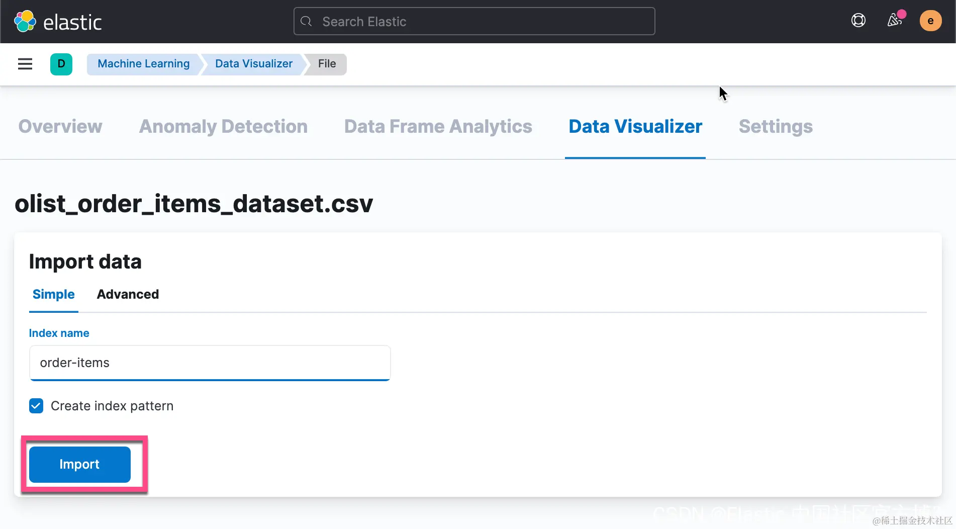 从上面的过程中,我们可以看得出来 import complete。为了查看摄入的数据,我们可以点击 View index in Discover: