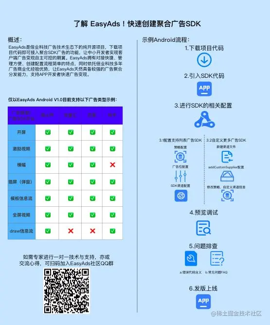 最后,EasyAds希望通过不断贡献开源代码、推出开放交流的QQ群等,与贡献代码和建议的研发人员,一起携手推动广告聚合SDK代码标准的建立。