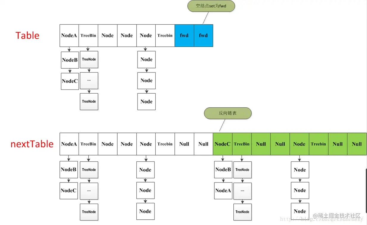 - 如果f为TreeBin节点,同样也是构造一个反序 ,同时需要判断是否需要进行unTreeify()操作,并把处理的结果分别插入到nextTable的i 和i+nw位置,并插入ForwardingNode 节点