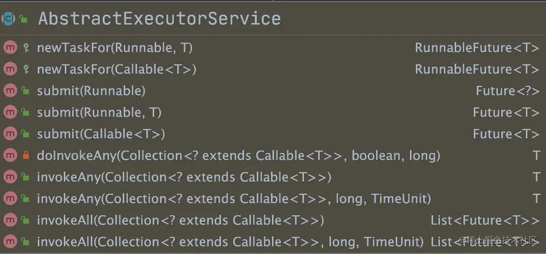 通过类的结构图可以看出抽象类实现了submit、invokeAll、invokeAny的方法。
