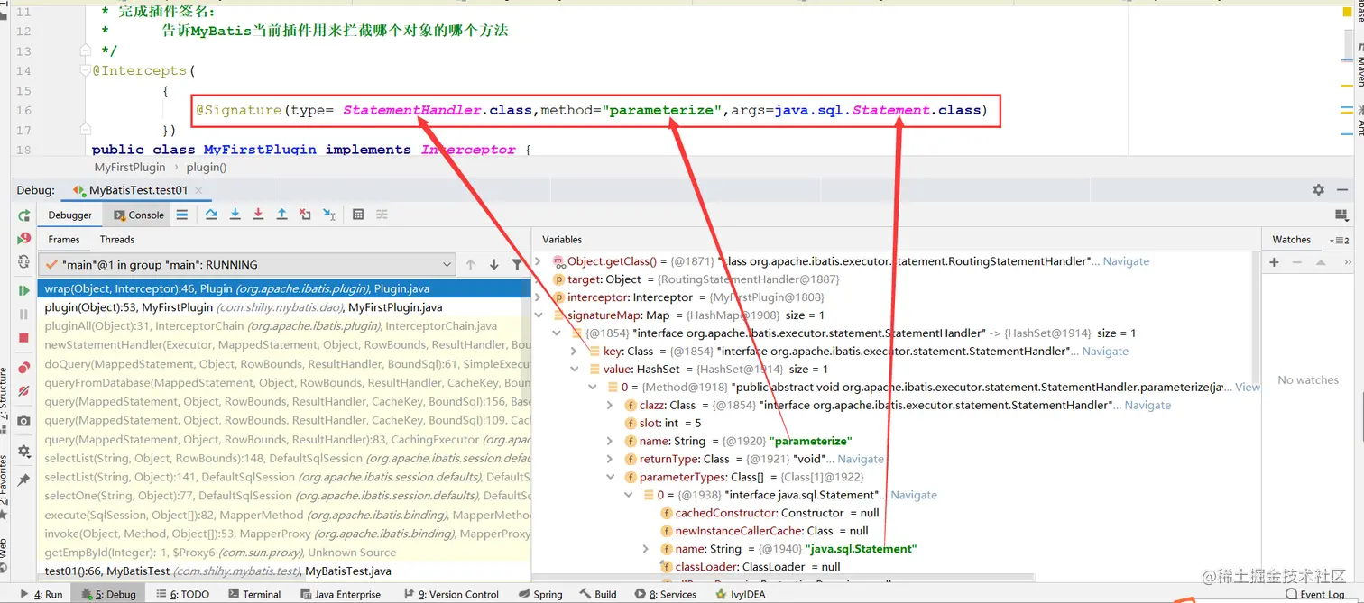 用户自定义的拦截器除了实现Interceptor 接口,还需要使用==@Intercepts== 和==@Signature== 两个 注解进行标识。@Intercepts 注解中指定了一个@Signature 注解列表,每个@Signature 注解中都 标识了该插件需要拦截的方法信息,其中@Signature 注解的type属性指定需要拦截的类型, method 属性指定需要拦截的方法 ,args 属性指定了被拦截方法的参数列表。通过这三个属性值, @Signature 注解就可 以表示一个方法签名, 唯一确定一个方法。